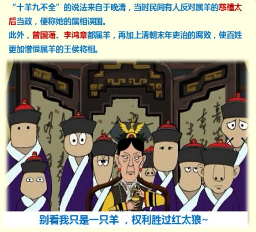 民间有一种迷信说法“十羊九不全”。眼看羊年就快到了,还在纠结年份不好要不要结婚吗?其实,关于羊年不吉利的说法还要追溯到清朝,因为慈禧太后属羊,民间为了推翻她而制造了这个谣言。并且,曾国藩和李鸿章都属羊,为了推翻清朝腐败的统治,捏造了“十羊九不全”的传说。