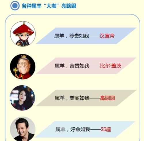唐太宗李世民、抗金名将岳飞、世界首富比尔盖茨、陈道明、周润发、最逗比的邓超、最近刚刚嫁人的女神高圆圆可都是属羊的哦。