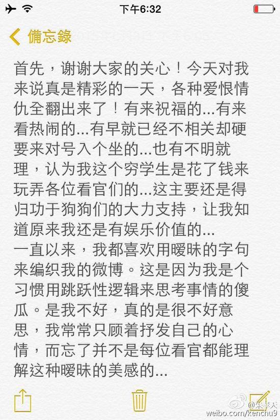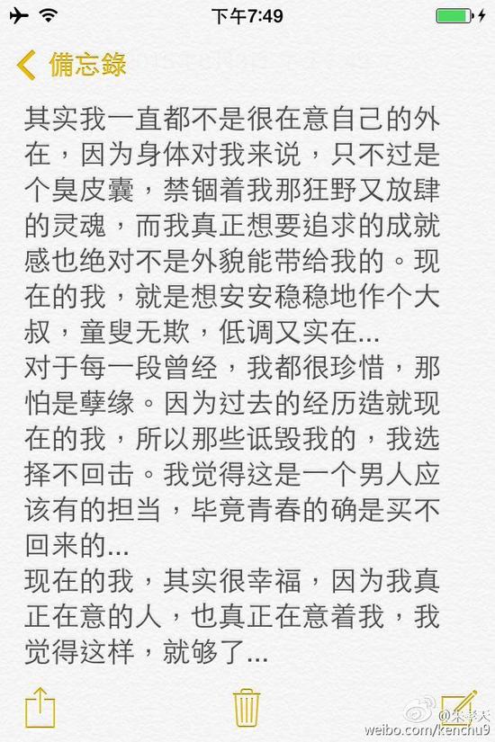 朱孝天发表长微博承认恋情