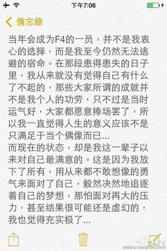 他对于恋情曝光后各路网友的看法表达自己观点“今天对我来说真是精彩的一天,有来祝福的,由来看热闹的,有的硬要对号入座的,让我知道原来我还是有娱乐价值的。”他表示当年成为F4的一员并不是自己衷心的选择,之所以有那些成就是因为运气好,大家愿意捧场,而自己的人生意义并不满足于当个粉偶像。