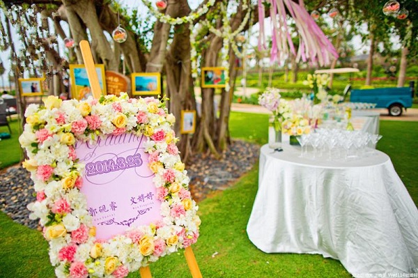 使用长脚立式迎宾牌,缀以用珠光白色或淡绿色缎带包扎 好的长春藤和白色羽毛,制成瀑布式下垂样式,用料需丰满。迎宾牌 用内附精美写真-内容:“在XX年我们结婚啦!”下附新郎、新娘的名称.