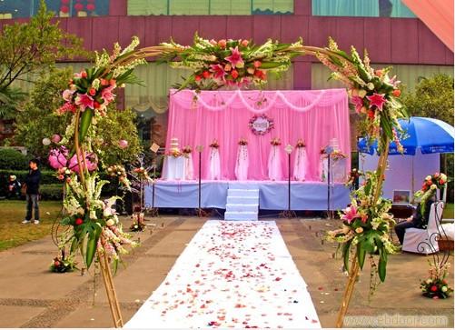 场地布置是没有“最高极”的,更多的新人只能从目前流行的款式来“跟风”,就拿“婚礼背景而言,比较典型的:最早比较流行心型的洋泡泡和大红双喜字,后来又有一段时间流行“大幅喷绘”作为背景,现在普遍流行“布艺背景”,除非新人本身或有朋友就是搞舞台布置的行家,并能获得这方面的技术资源,否则很难跨越这个“流行”。因此本篇也就在此范围下进行建议: